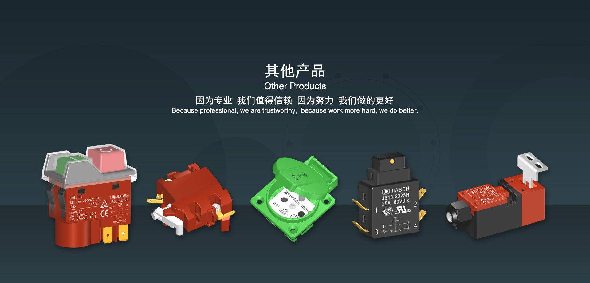 浙江佳奔電子有限公司始建于1986年,坐落于浙江省樂清市虹橋鎮(zhèn)東電子信息產(chǎn)業(yè)園內(nèi),現(xiàn)有職工700多人,資產(chǎn)總額超3億元。公司主要經(jīng)營“JIABEN”牌微動開關(guān)、蹺板開關(guān)、按鈕開關(guān)、扳機開關(guān)、調(diào)速開關(guān)和電位器開關(guān)等各類交、直流器具開關(guān)和各類交、直流線路板模塊等產(chǎn)品,主要應(yīng)用于交、直流電動工具、電動園林工具、清潔器具、家用電器和小型機床等行業(yè),是集產(chǎn)品設(shè)計、研發(fā)、制造、銷售和服務(wù)于一體的國家高新技術(shù)企業(yè)。JIABEN was founded in 1986, located in East Electronic Information Industry Park, Hongqiao Town, Yueqing City, Zhejiang Proviance, existing staff more than 700 peoples, more than 300 million RMB worth of assets. Company is mainly engaged in "JIABEN" brand Micro Switch, Rocker Switch, Push-button Switch, Trigger Switch, Speed Regulating Switch, Potentiometer Switch and other kinds of appliance switch and all kinds of AC or DC circuit board module, such as more than 100 series, 8000 kinds of models of products, mainly used in AC or DC Power-tools, Power Gardening Tools, Cleaning Appliances, Household Appliances and Small Machine Tool and other industries, is the collection product design, research and development, manufacturing, sales and service in one of the national high and new technology enterprise.